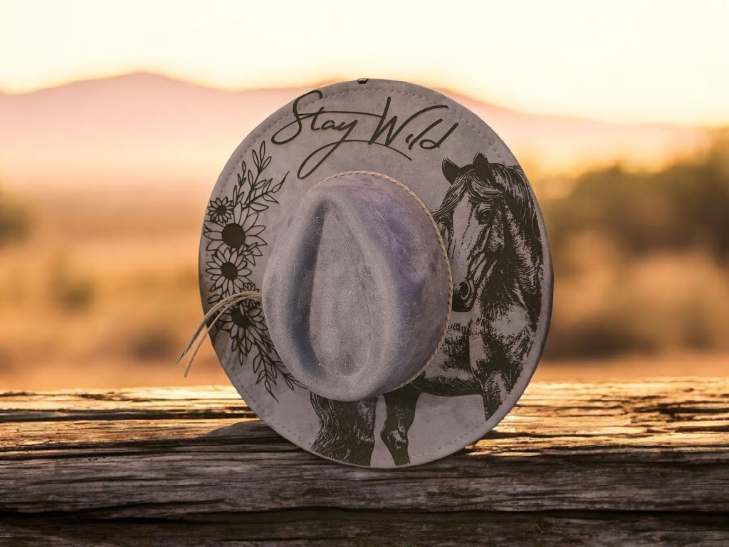 Embrace your wild side with this striking suede wide brim hat, featuring an eye-catching horse floral design. Perfect for making a bold statement while shielding yourself from the sun, this versatile piece combines rugged style with artistic flair. Whether you're heading to a festival, ranch day, or casual outing, this hat delivers personality and protection in one statement-making accessory.